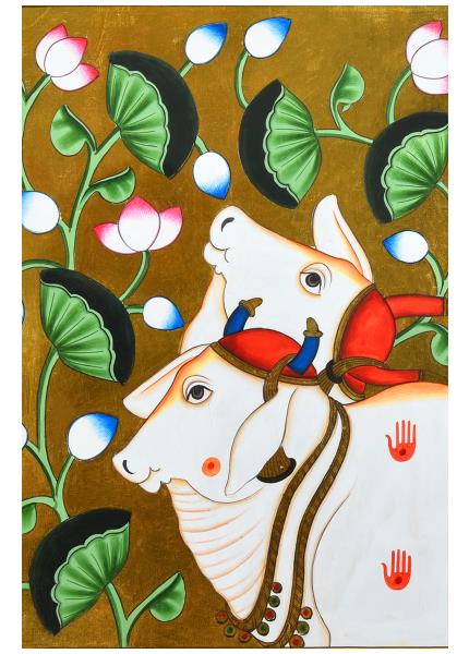 This handmade pichwai painting features a beautiful composition of holy cows.
