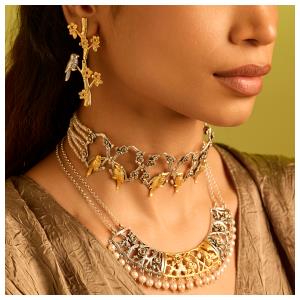 Bringing together time-honoured Indian artistry and a modern sensibility, the Kimaya Collection features handcrafted, gold-plated silver jewels beautifully adorned with intricate pearls and glass stones.